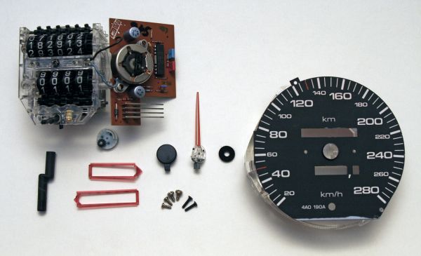 Be careful during removing the needle, and also when undoing the black label screws - a slipping screwdriver can leave a nasty mark on your dial. After undoing the screws that fix the PCB and stepper motor to the odometer body, just carefully bend the whole PCB to the side and finally meet the planetary gearset. For installing the new gears, you won't need any lubricants, as there's no high load (the RPM is low, and also the torque of the stepper motor). Now just put it together again in reverse order. When assembling the planetary gearset, be careful, because improper alignment may cause the gears to lock and not count, despite the new gear. (Unless you want to disassemble the whole thing again, just for the fun of it :) Now you only want to know, where could you get such lovely little planetary gears, right? Check out my ebay store, maybe you find something interesting ;)