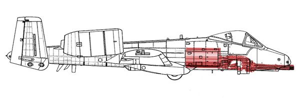 A fegyverzet meghatározó eleme a gatling-rendszerű 30mm-es GAU-8A Avenger gépágyú. Tekintélyes méretű és tűzerejű fegyver, hossza 6,4m, tömege a teljes lőszer javadalmazással együtt 1723 kg, a tüzelés visszaható ereje mindegy 4 tonna (a teljes tolóerő fele!).Hogy ez az erő tüzeléskor ne fordítsa ki a gépet célirányból, igen körültekintően kellett meghatározni a beépítés pontos helyzetét. Az Avenger a gép hossztengelyétől kissé balra eltolva került beépítésre. Ennek magyarázata hogy a lövedékek a forgócső 9 órai pozíciójában (szemből nézve) hagyják el a csövet, így (a fegyver hossztengelye helyett) ebbe az egyenesbe esik a visszaható erő támadáspontja. A hatalmas gatling lényegében kitölti a törzs teljes orr-részét, az orrfutót is oldalra kellett helyezni emiatt. A hatalmas henger az ágyú mögött a lőszerkészlet tárolására szolgál. A kiürült lőszerhüvelyek is ide kerülnek vissza, kiszórás esetén ugyanis beszippanthatnák őket a hajtóművek